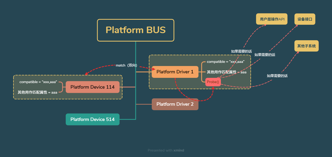 - Platform Bus (总线):作为中介,负责匹配设备和驱动。