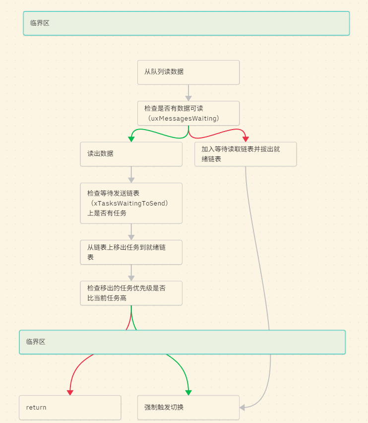 FreeRTOS 的解决办法:如果你要传大块数据,你可以把指向大块数据的“指针”作为一个变量(4字节)塞进队列,这样既享受了队列的同步机制,又避免了大量内存拷贝。(但此时你需要自己管理那块大内存的生命周期)。